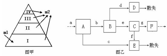 下图甲为某湖泊生态系统的能量金字塔简图,其中I、Ⅱ、Ⅲ、Ⅳ分别代表不同的营养级,m1、m2代表不同的能量形式。图乙表示能量流经该生态系统某一营养级的变化示意图,其中a~g表示能量值的多少。请据图作答: