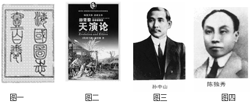 如图,当西方走向近代化之时,中国也开始了艰苦的探索历程。近代中国的仁人志士为实现强国之梦不断汲取先进思想,大胆实践,为探索出一条民族复兴之路做出了不懈努力。 结合所学知识,请回答 (1)图一著作的作者是谁?他在书中提出了什么主张? (2)图二译著的作者是谁?他将西方什么学说介绍到中国?宣扬怎样的观点? (3)图三人物领导革命的指导思想是什么?其领导的革命运动最大贡献是什么? (4)以图四人物为领导的思想解放运动高举哪两面大旗?这次思想解放运动产生了哪些积极影响?
