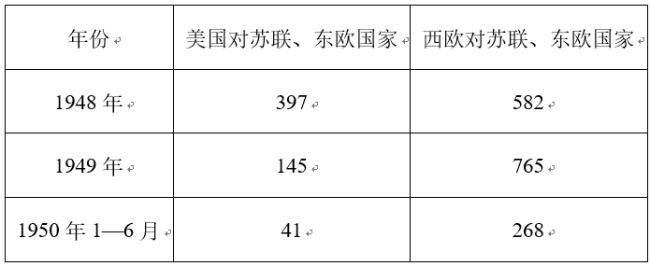 如表美国与西欧对苏联、东欧国家贸易出口额 比较单位:百万美元,如表作为直接论据,可用来探究的论题是( )