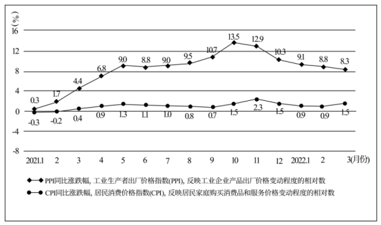 2021年以来,以原油、铁矿石、有色金属等工业基础原材料为代表的国际大宗商品价格持续上涨,直接推高我国工业生产者出厂价格指数(PPI)但PPI上行并未驱动居民消费价格指数(CPI)同步上行,PPI与CPI总体呈“剪刀差”变化(见下图)。这一状况对我国产业链上游部分企业有好处,对大量处于产业链中下游的中小企业,如以钢板、铜材、橡胶、ABS塑料为主要原材料的小家电生产企业,却带来了很大的生产经营压力。