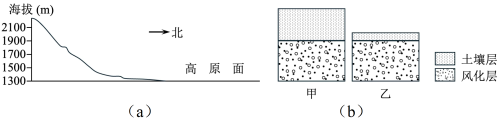 H山及其以北的内蒙古高原气候干旱,沙尘暴多发。图(a)示意H山北侧的地形。图(b)示意H山北侧广阔的高原面(平均海拔 1300 米)和山腰平缓区(平均海拔 1800 米)的土壤剖面(多个重复采样的平均值)。据此完成下列问题。