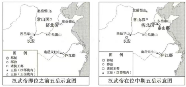 汉武帝在位中后期,多次巡行祭祀五岳。此后,五岳祭祀的国家制度逐渐完善。读图可知,汉武帝(